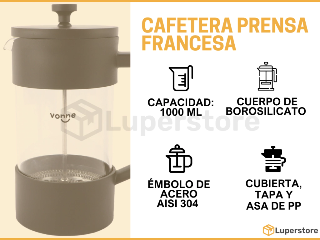 • Capacidad: 1000 ml• Medidas: diámetro 10 cm / ancho total 17 cm / alto 21,5 cm• Cuerpo de borosilicato• Émbolo de acero AISI 304• Cubierta, tapa y asa de PP