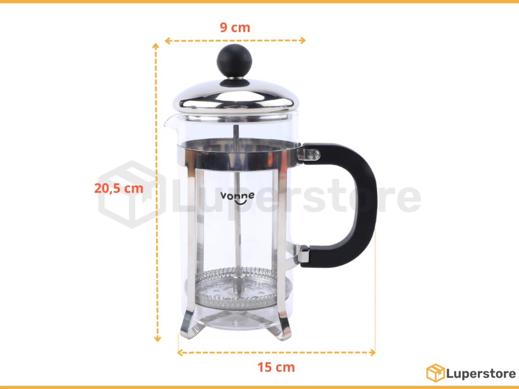• Capacidad: 600 ml• diámetro 9 cm / ancho total 15 cm / alto 20,5 cm• Cuerpo de borosilicato• Émbolo de acero AISI 304• Cubierta y tapa exterior de acero inoxidable• Perilla, asa y tapa interior de PP