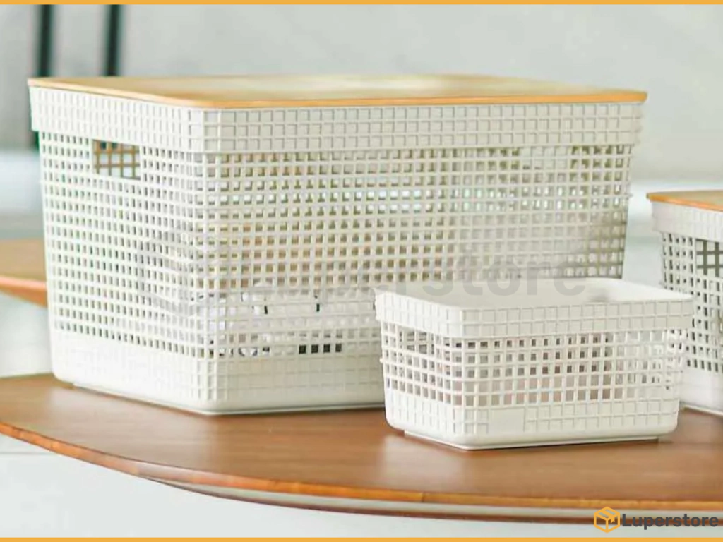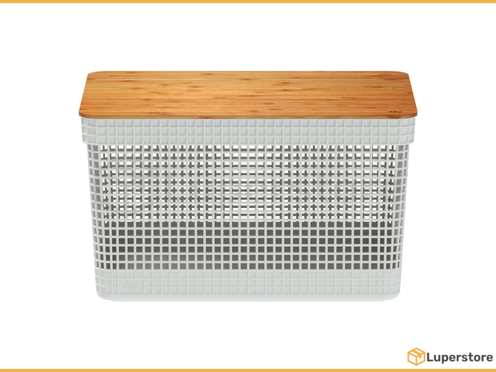 • Capacidad: 20 litros.• Medidas: largo 39 cm / profundidad 29 cm / alto 26,2 cm• Materiales: Polipropileno (PP) + tapa de bambú natural• Diseño abierto para ventilación del contenido• Ideal para ropa, juguetes, accesorios y más• Color: blanco
