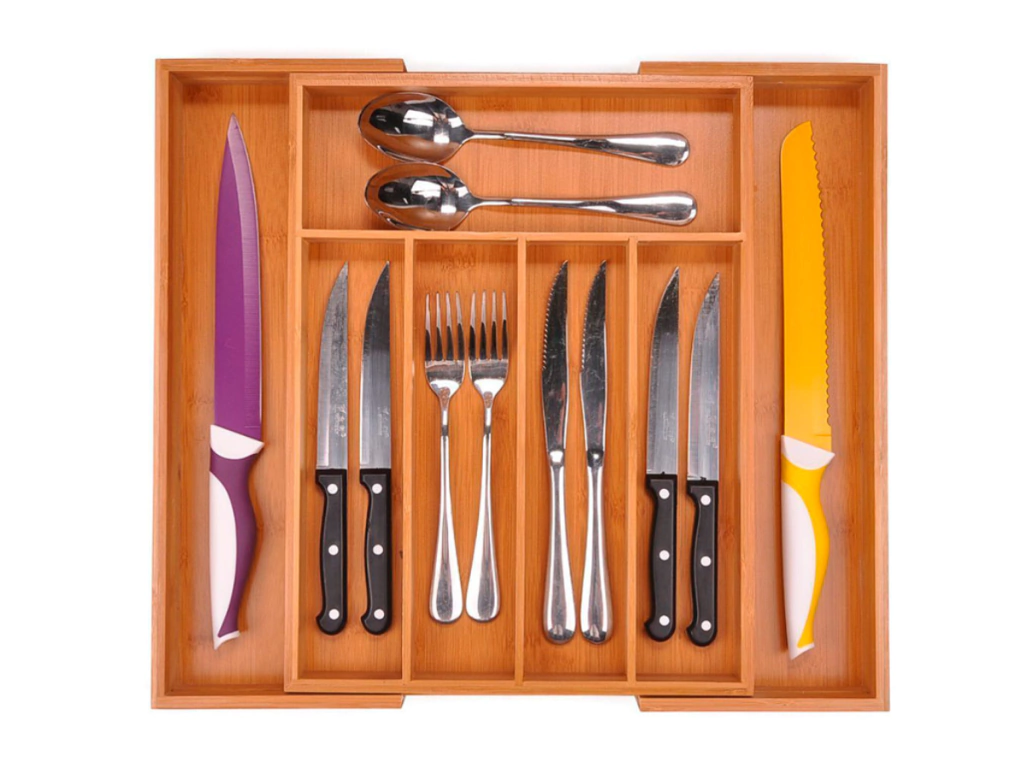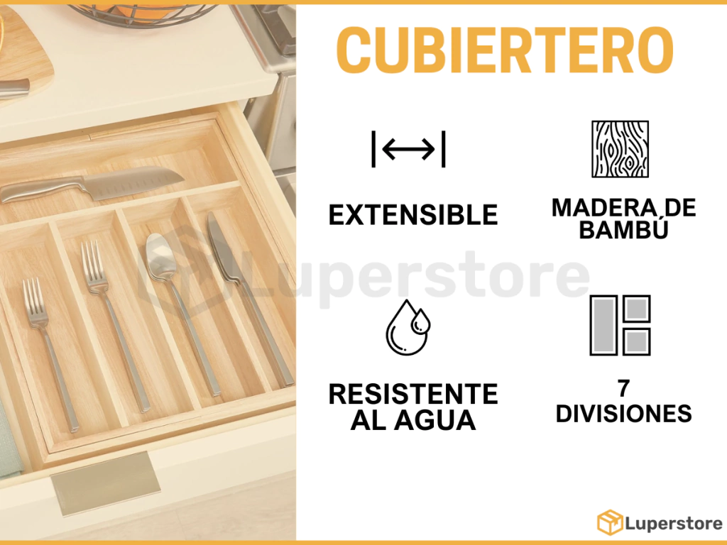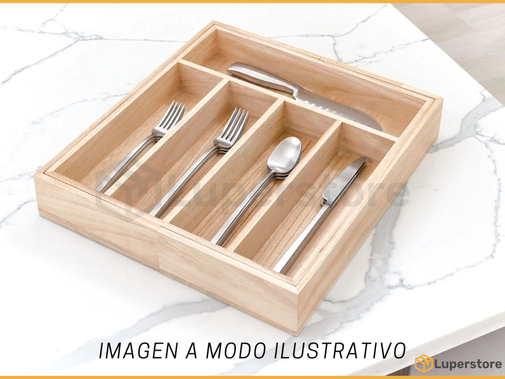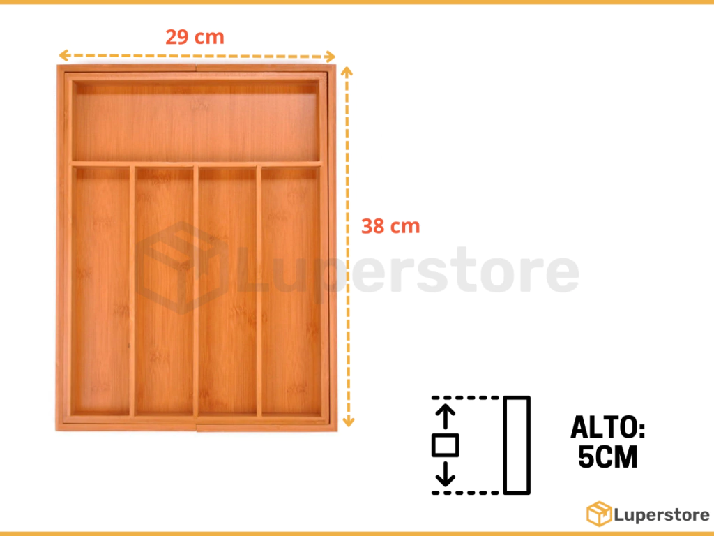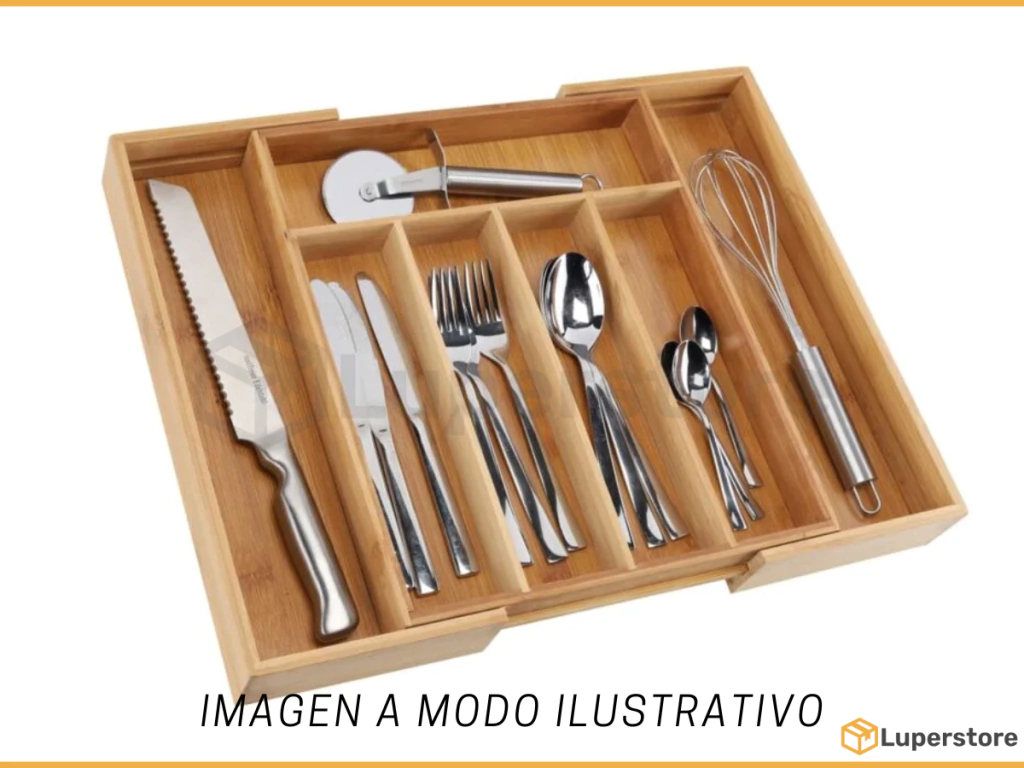 • Medidas: ancho 29 cm / profundidad 38 cm / alto 5 cm• Medidas extendido: ancho 48 cm / profundidad 38 cm / alto 5 cm• Material: madera de bambú• Divisiones: 7