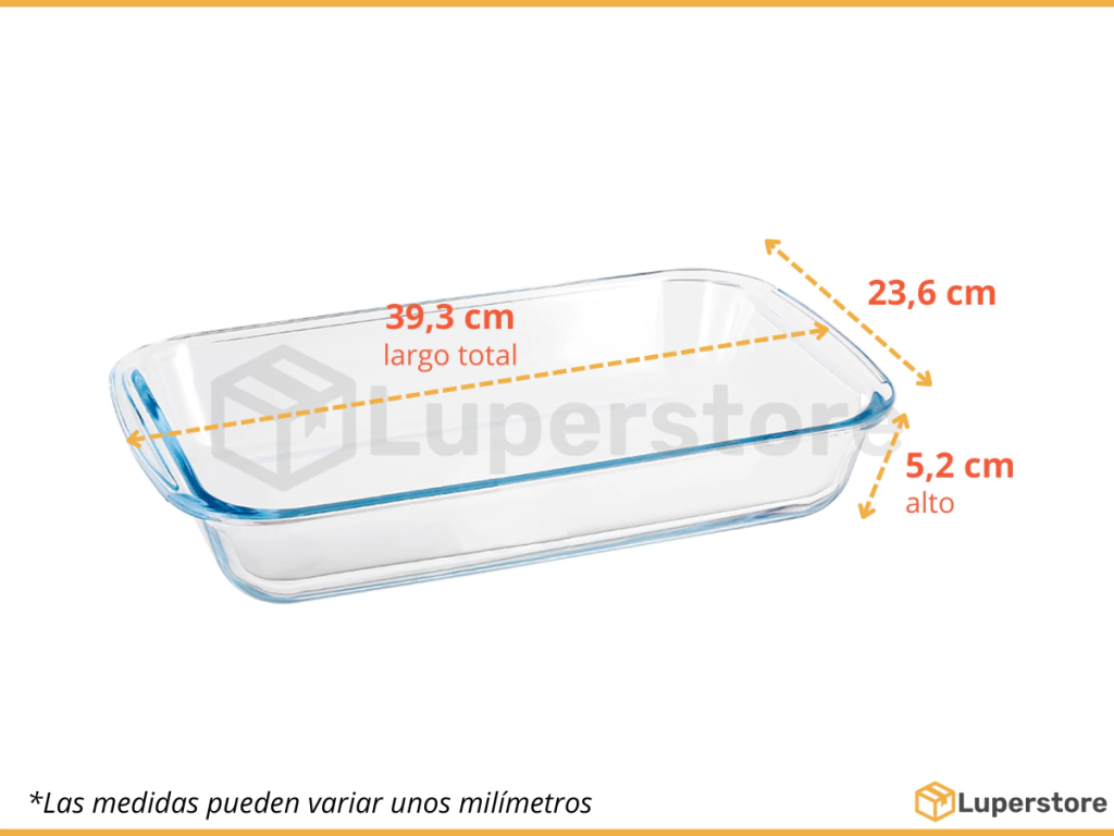 • Material: borosilicato• Medidas: largo 39,3 cm / ancho 23,6 cm / alto 5,2 cm• Apto freezer, microondas, lavavajilla y horno