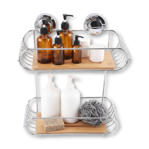• Material: latón cromado y bambú• Medidas: largo 28 cm / profundidad 12 cm / alto 31 cm• Dos estantes con dos ventosas• Peso soportado: 5 kg• Peso: 0,7 kg
